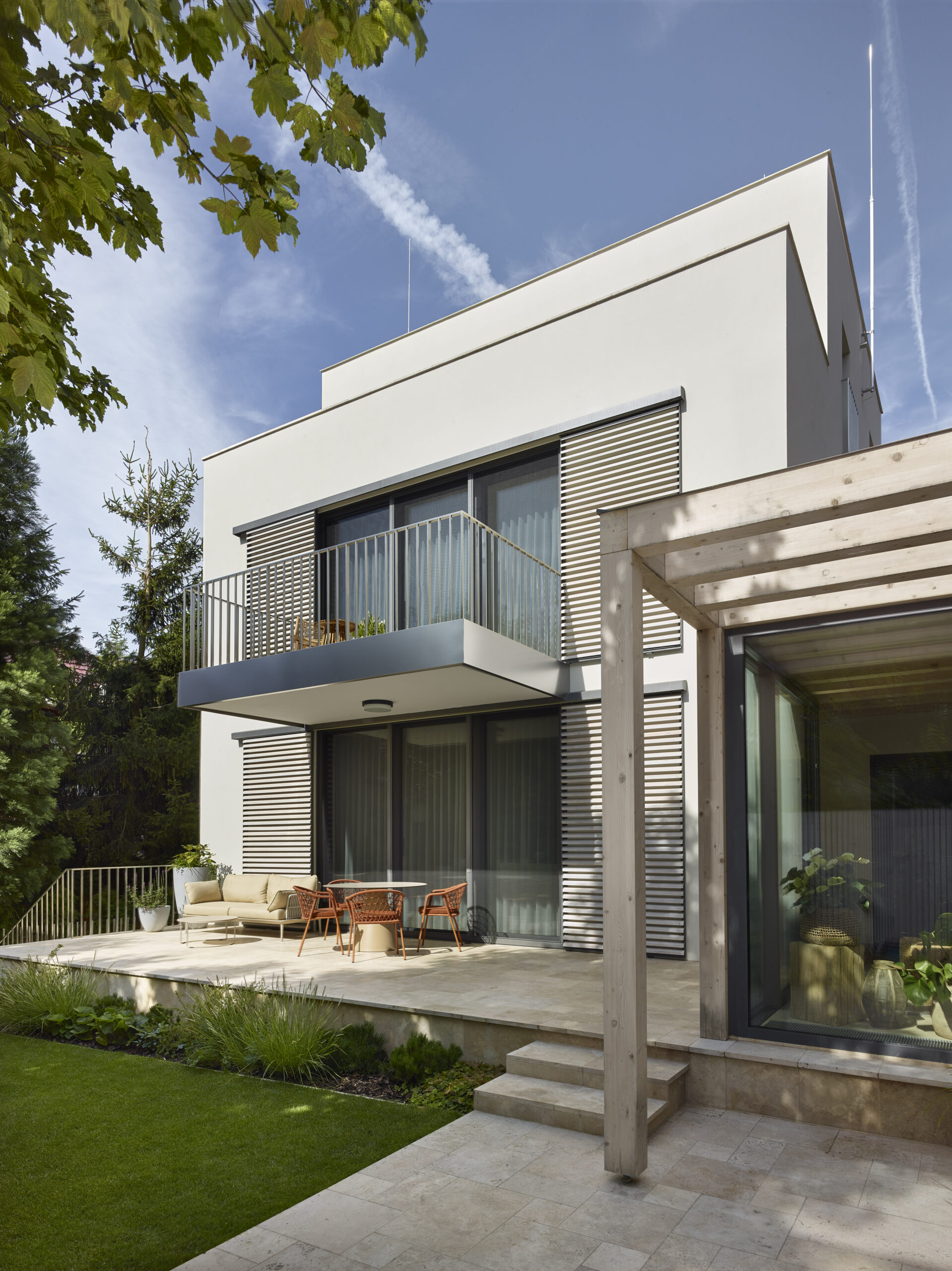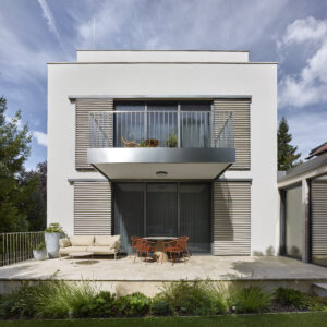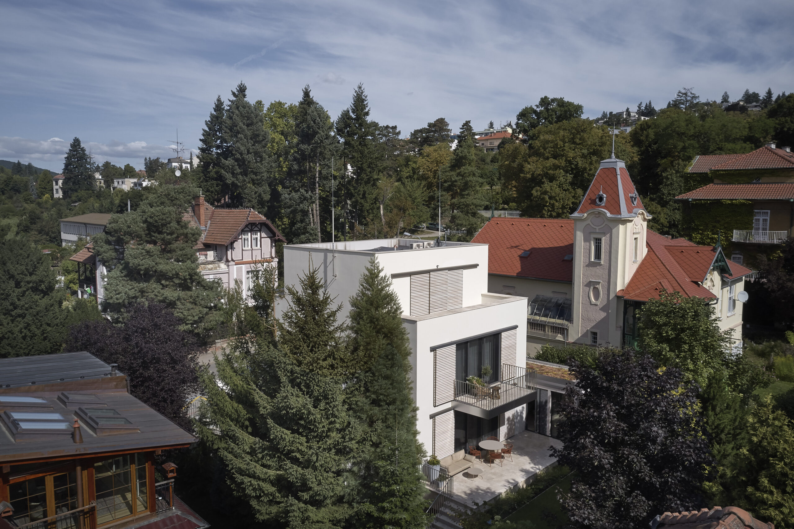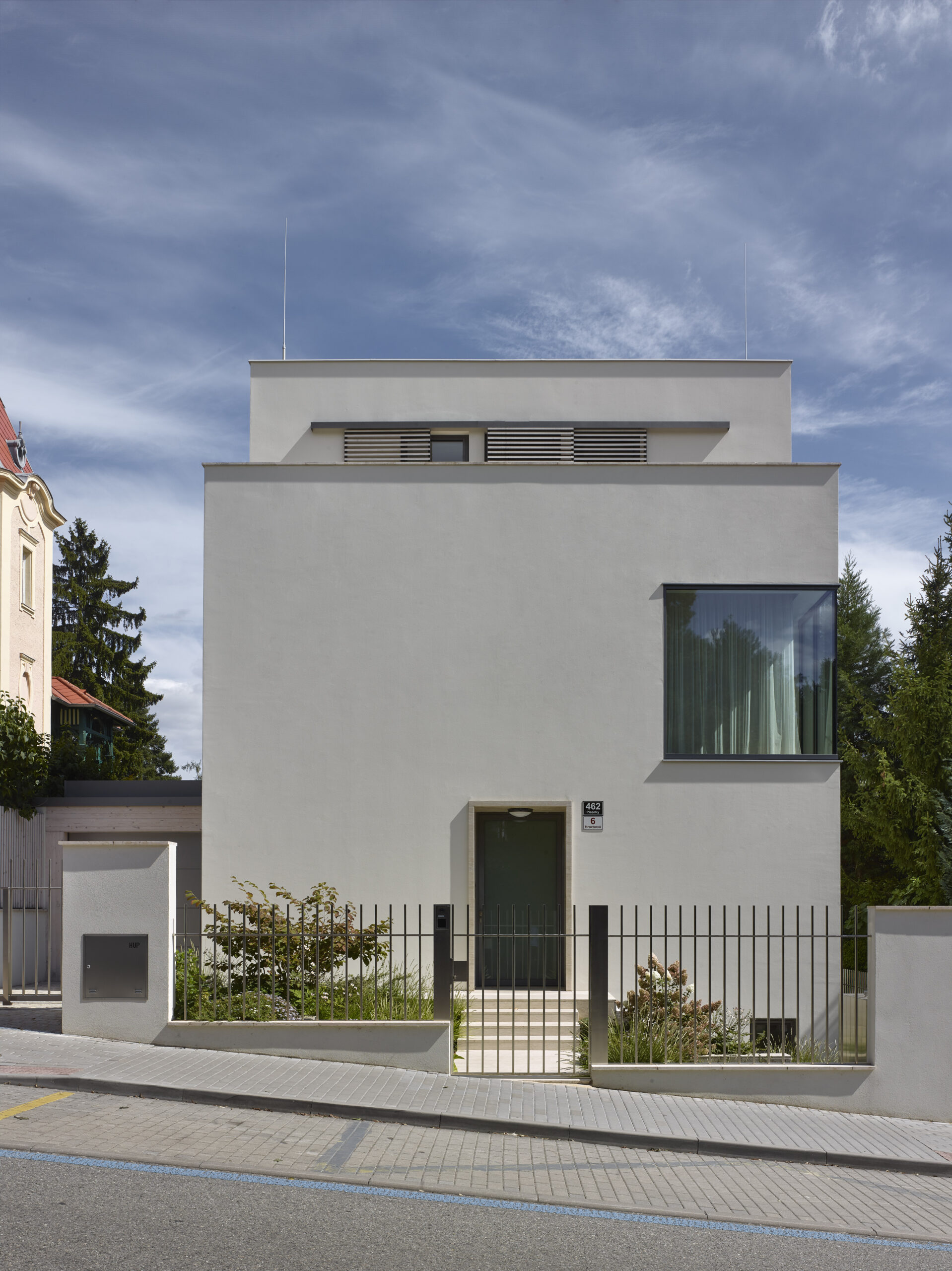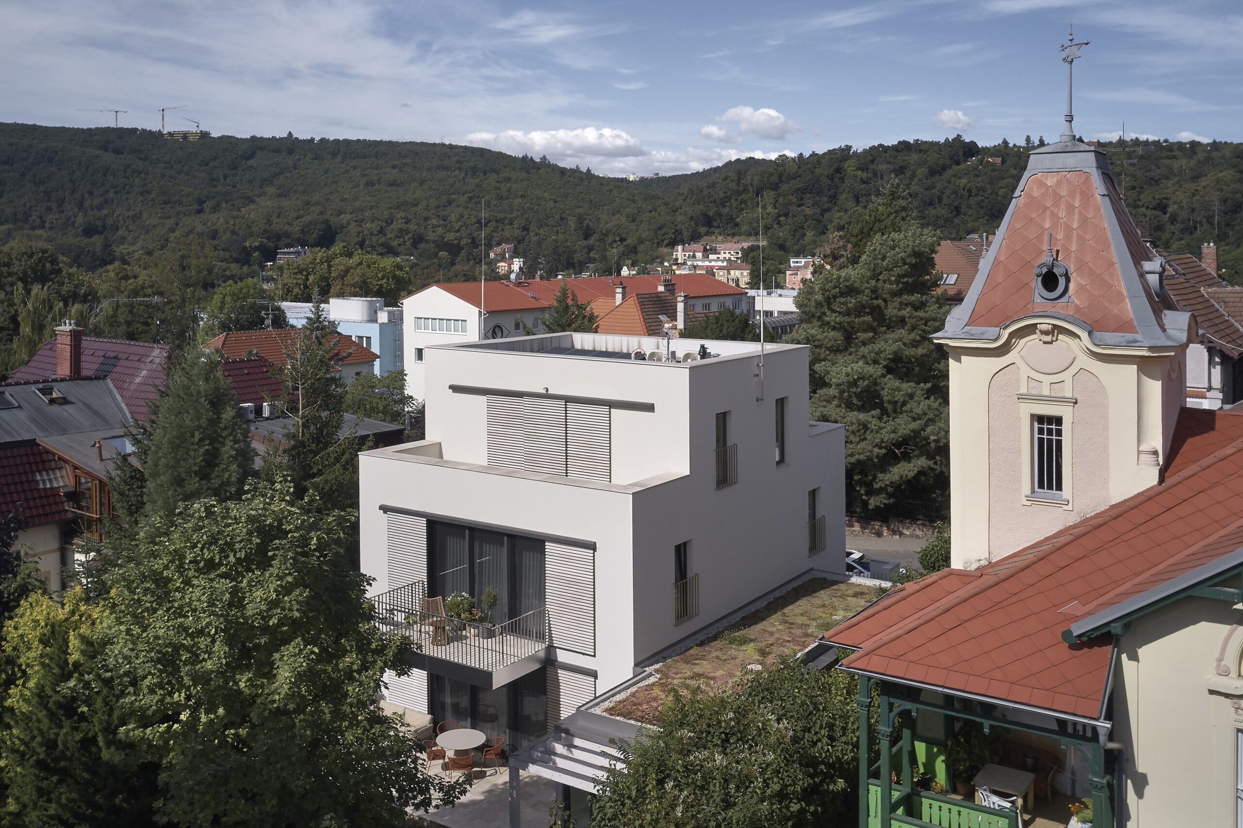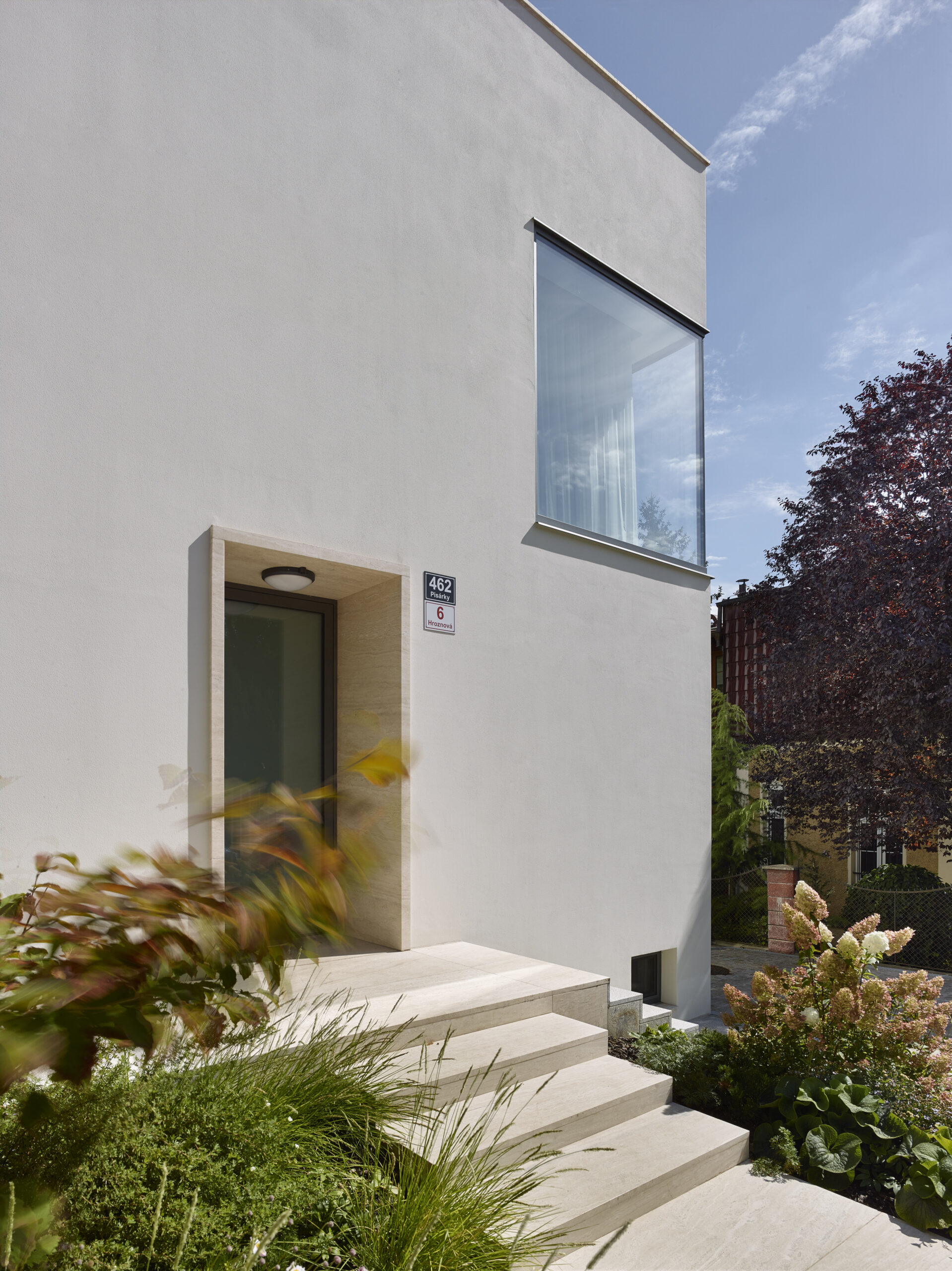 Architektonický výraz původního objektu zřejmě ze 60.tých let 20. století byl směsí všech možných materiálů a kompozic spoluvytvářejících celek na jakoby funkcionalistickém základě. Dům svým tvarem vycházel z kompozičních potřeb půdorysů. Materiálové řešení je pojednáno jako směsice různých materiálů, která byla v době výstavby k dispozici. Barevné pojednání fasády je řešeno jako břízolitová omítka charakteristická pro období, ve kterém dům vznikl.  Architektonický výraz dostavby se nesnaží o napodobení stávající budovy. Důraz je kladen na řemeslný detail, který ve výsledné hmotě hraje hlavní roli. Z tohoto důvodu jsou zvoleny kamenné dlažby a probarvená vápenná omítka ve hmotě. Tyto požadavky určují výraz budovy, která se dokáže důstojně vyrovnat s historizující výstavbou okolí.  Architektonicky se jedná o kvádrovitý štíhlý objekt s ustupujícím posledním patrem, který se v detailu a proporcích jednotlivých vyjadřovacích prostředků jednoznačně odkazuje k jednoduchosti a smyslu pro detail. Je zde také čitelné citlivé doplnění objemu dostavby ke stávajícímu objemu domu. Barevnost je odvozená od původního sousedního objektu nad stávajícím domem. Povrchová úprava měkkou, vápennou ručně hlazenou omítkou si klade za cíl působit přirozeně. Stávající objekt je podsklepený dvoupodlažní rodinný dům bez historické hodnoty. Jedná se téměř o obdélný půdorys s výčnělkem pro technické zázemí. Hlavní vstup má situován ze severní boční strany, na který navazuje vstupní hala se schodištěm. Z haly mají návaznosti ostatní pobytové místnosti obývacího pokoje, kuchyně a WC. V patře jsou umístěny všechny ložnice domu s koupelnou a WC. Sklep je rozdělen na několik místností je využíván ke skladování potravin a ke garážování automobilu. Stávající fasáda je řešena břízolitovou omítkou a do ulice a zahrady má dva balkóny. Zahrada je řešena částečně jako zelená plocha s vybetonovanou pochozí plochou při vstupu z ulice. Na pozemek je přístup pouze z ulice Hroznová jak pro pěší, tak jako jediný vjezd na pozemek do garáže v suterénu. Návrh řeší přestavbu a přístavbu objektu včetně úprav okolních ploch a zahrady. Je navržena kompletní úprava vnitřních dispozic, a způsobu členění vnitřních prostor s ohledem na současné požadavky. Přístavba RD je nově objektem s 1 podzemním, 3 nadzemními podlažími. Architektonický vzhled přístavby je podmíněn stávajícím objektem, ze kterého vychází svou koncepcí.