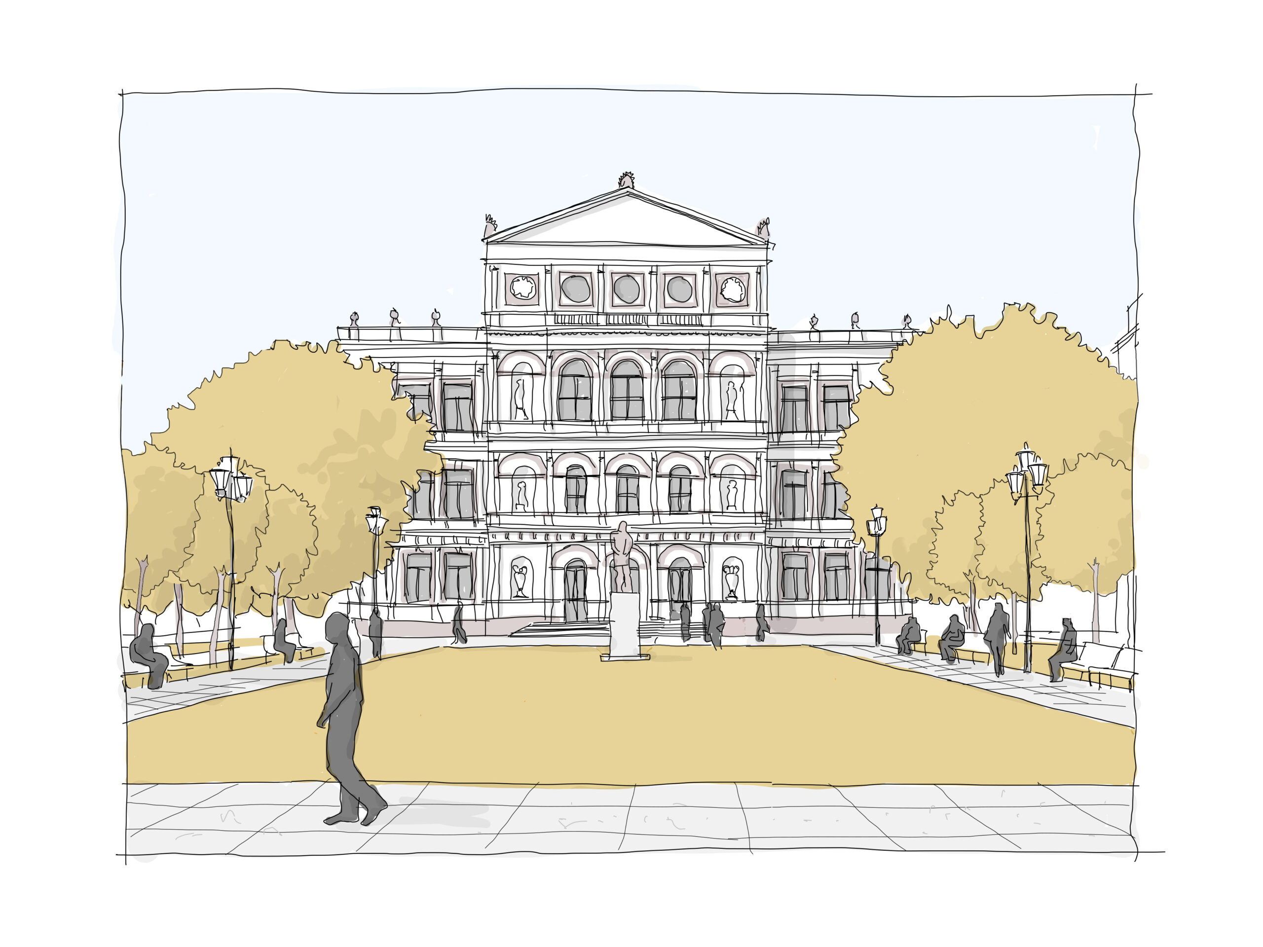 Nově navržené členění povrchů na Masarykově náměstí řeší jednak problémy zobrazené dále v problémovém výkrese (nedostatek plochy pro pěší; nekoncepční řešení dopravy zabírající příliš mnoho místa) a zároveň se snaží celému místu vtisknout jasnou strukturu. Ta vychází ze skutečnosti, že prostor před Justiční akademií byl původně zelený pás vzniklý po zbourání hradeb. Mnohé města takto vzniklý pruh v historii využily jako zelený pás, nabízející uvnitř stísněné středověké struktury města trochu vegetace a odpočinkový prostor pro obyvatele. Příkladem v tomto směru může být třeba Vídeň nebo Brno. Oproti stávajícímu stavu je tak plocha trávníku zvětšena a doplněna stromy zajišťující v jinak otevřeném urbanistickém prostoru určité ohraničení a vymezení pobytové plochy. Stromořadí zároveň jasně vymezuje a rámuje pohledovou osu na průčelí Justiční akademie.